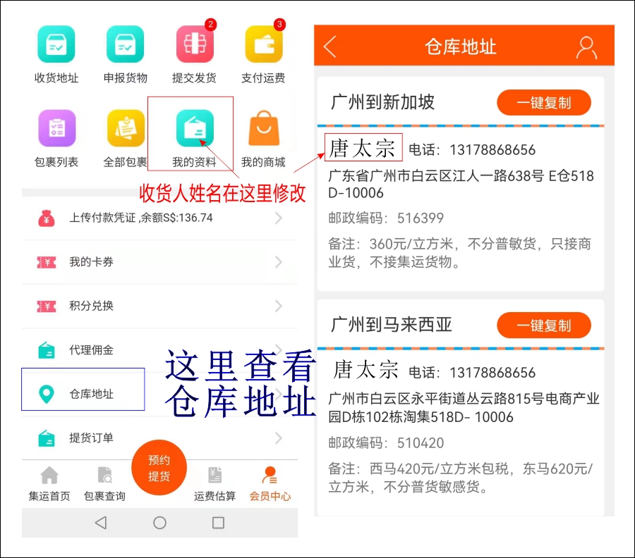 每個顧客都有自己的獨有唯一地址,請到這里查看:微信公眾號--會員中心--倉庫地址: