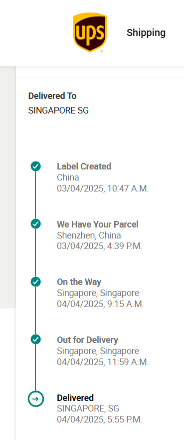 周一中午前下單,下午打包完畢,稱重計(jì)費(fèi)付款,周二就出UPS單號(hào),周三送到新加坡。