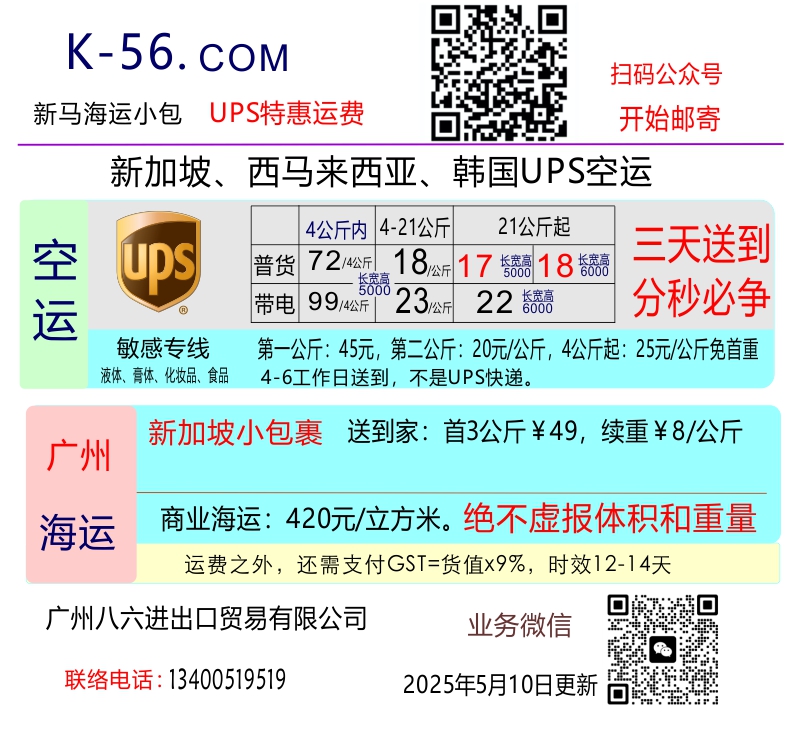 以下是我們的運(yùn)費(fèi)表格,廣州到新加坡UPS運(yùn)費(fèi),